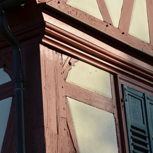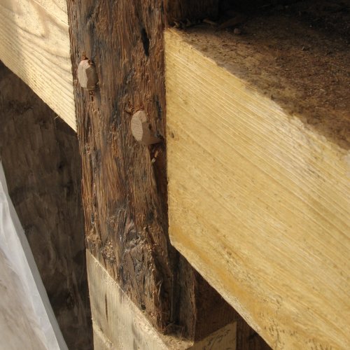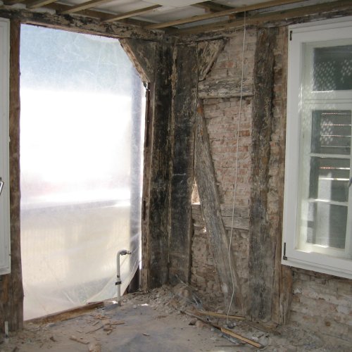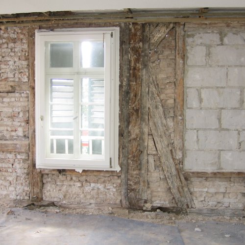 Das Fachwerk selbst zeigte starke Schäden. Die geschädigten Bereiche wurden ausgetauscht bzw. durch Aufblattungen, Anlaschungen und Ausspänen etc. repariert, sowie anschließend mit NHL verputzt, wobei die Anschlüsse ans Holz keilförmig ausgeschnitten wurden und hier eine dickere Putzschicht für bessere Stabilität aufgetragen werden konnte.